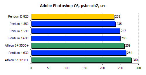 The results of Pentium D 820 tests in signle-threaded office applications are pretty logical: dual-core CPU is slower than its single-core fellows with higher clock frequency.