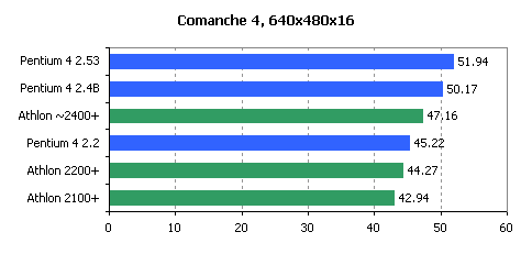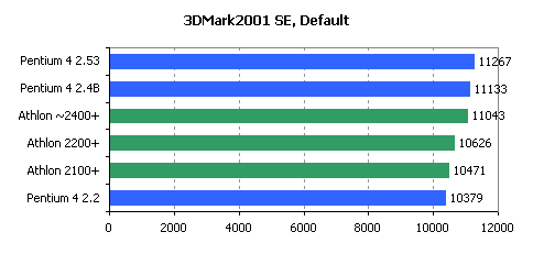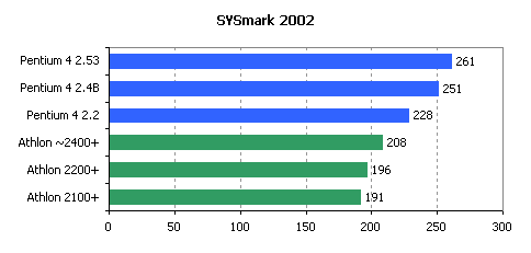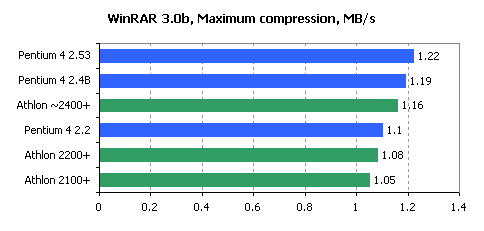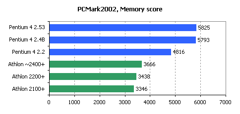 As for performance, we can only state that AMD has fallen behind Intel and can\'t now offer processors performing close enough to Pentium 4 2.53GHz. New Athlon XP 2200+ in most cases works just a little bit faster than Pentium 4 2.2GHz. Moreover, as the SSE2 instructions set is getting popular, Pentium 4 processors show even better results. If we add to that the recent transition of Pentium 4 processor family to 533MHz bus, which also contributed in a way to its performance, then it\'s quite possible that Athlon XP rated adequately to the Intel processors core clock will be lagging behind them in a lot of applications.